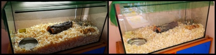 4.6.2019 = Hezky den, terarium ma rozmery 50x25, snad to nebude pro ne male. Terarium jsme dali do pokojicku, i kdyz tam si myslim, ze je vetsi frmol nez na chodbe. Dneska jsme jim dali misku s jemnym prachovym piskem. Byli nadseni a uz se tam rochni. Domecek maji to vlevo z rozbiteho kvetinace. Na brizu nahoru si splhaji. Mozna by to chtelo zkratit, aby na vrcholu mohli jeste panackovat. Jeste premyslim, ze bych jim dala mensi ten kus parezu a jeste jednu misku nebo vetsi s piskem...pisku mam dost, mohla bych jim ho vysypat misto tech pilin, co myslite? Jak casto se prosim meni piliny? Jinak kluci jsou ciperni. Mam pocit ze cerny Fred trochu dava cocku Georgovi-u jidla, v pisku...ho postuchuje. Ale to je asi normalni . Jak casto mame cistit to terarium? Dekuju za zpravy Petra