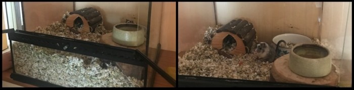 3.6.2019 = Dobry den Bodlinko, posilam foto domecku nasich dvou chlapecku. Jeste chybi ten pisek. Privezla jsem ted z beach volejbaloveho turnaje v Ostrave :-). Jsou strasne rychli, jeste hodne plasi. Cerny Fredik je vic kamaradsky, zvedavy. Zrzavy je hodne plachy a nejradeji travi css ve svem ukrytu. I jidlo si tam nosi... Budeme vas postupne informovat, snad si na nas zvyknou Dekuji