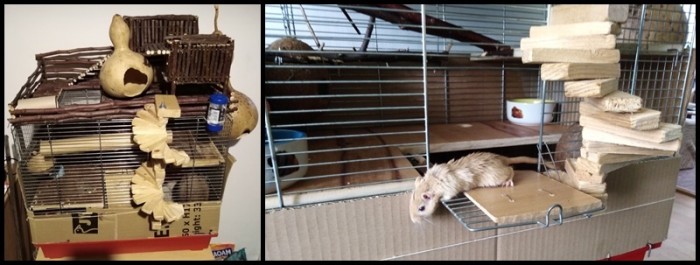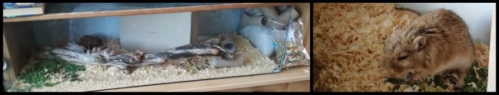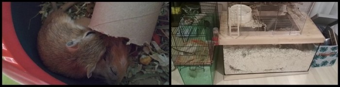 20.9.2019 = Dobré ráno, holky prožily noc v terárku, ale odděleně klecí. Malá stále píská, jakmile se k ní Pepča přiblíží. Je hodně vystrašená. V ohrádce je to lepší, ale jakmile je domeček, tak si do něj vleze a píská při kontaktu. Teď jsou spolu a každá si něco kutá, ale píská stějně při přiblížení. Tak snad se to porovná brzy.